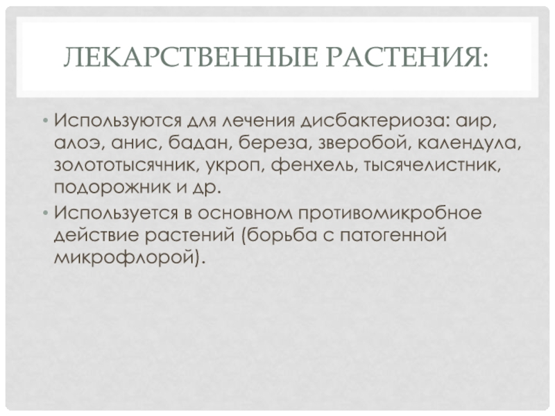Лекарственные растения:Используются для лечения дисбактериоза: аир, алоэ, анис, бадан, береза, зверобой, календула, золототысячник, укроп, фенхель, тысячелистник, подорожник