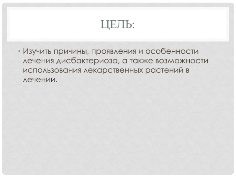 Цель:Изучить причины, проявления и особенности лечения дисбактериоза, а также возможности использования лекарственных растений в лечении.