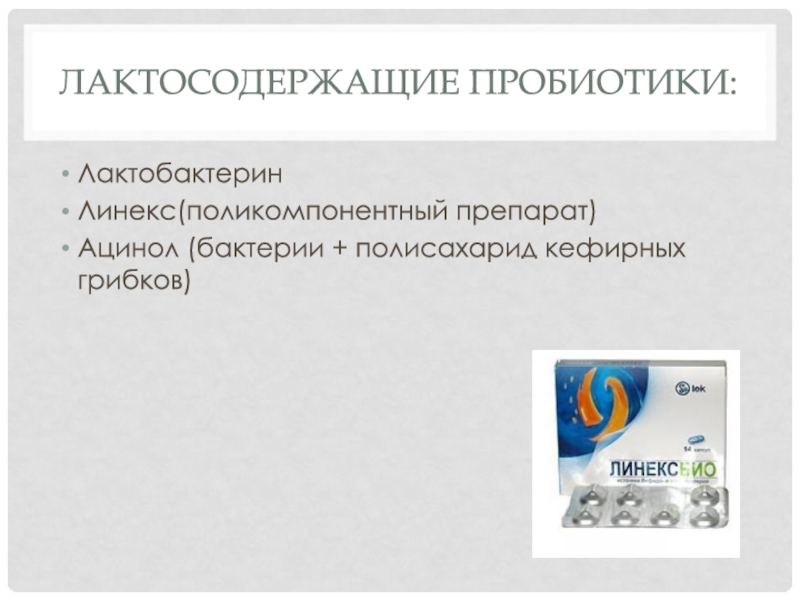 Лактосодержащие пробиотики:Лактобактерин Линекс(поликомпонентный препарат)Ацинол (бактерии + полисахарид кефирных грибков)