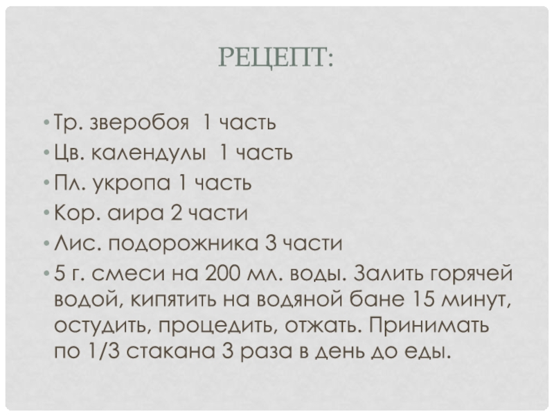 Рецепт:Тр. зверобоя 1 частьЦв. календулы 1 частьПл. укропа 1 частьКор. аира 2 частиЛис. подорожника 3 части5 г.