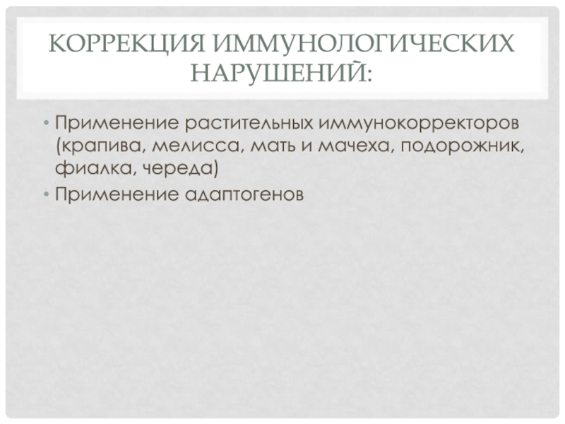 Коррекция иммунологических нарушений:Применение растительных иммунокорректоров (крапива, мелисса, мать и мачеха, подорожник, фиалка, череда)Применение адаптогенов