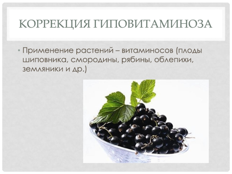 Коррекция гиповитаминозаПрименение растений – витаминосов (плоды шиповника, смородины, рябины, облепихи, земляники и др.)