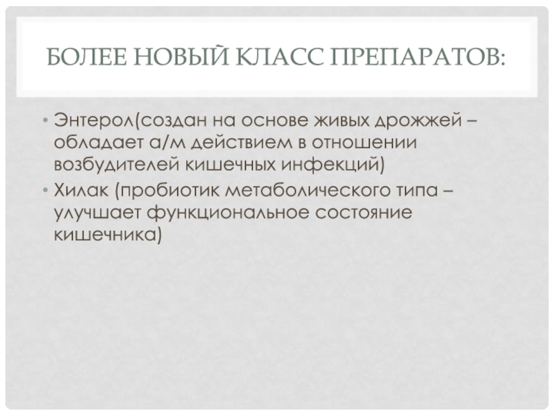 Более новый класс препаратов:Энтерол(создан на основе живых дрожжей – обладает а/м действием в отношении возбудителей кишечных инфекций)Хилак