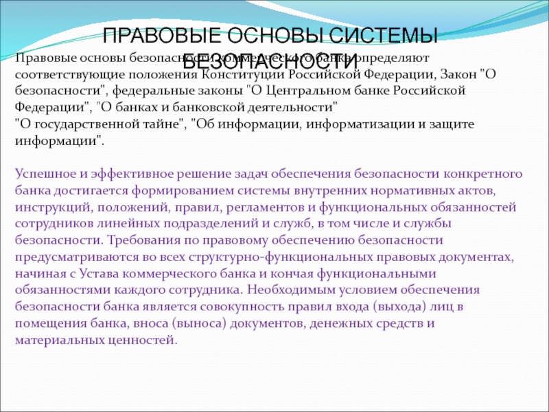 правовые основы, виды угроз безопасности и ресурсы, подлежащие защите, а также основные направления разработки системы безопасности, включая правовую,