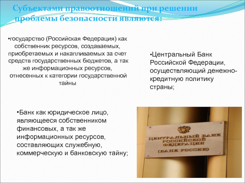 •Банк как юридическое лицо, являющееся собственником финансовых, а так же информационных ресурсов, составляющих служебную, коммерческую и банковскую тайну;