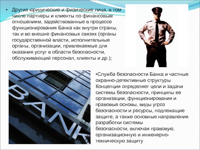 •Служба безопасности Банка и частные охранно-детективные структуры Концепция определяет цели и задачи