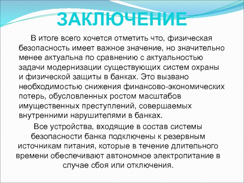 Все устройства, входящие в состав системы безопасности банка подключены к резервным источникам питания, которые в течение длительного времени обеспечивают автономное электропитание в случае сбоя или отключения.
