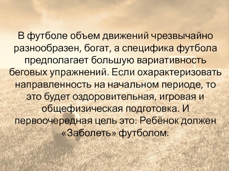 начальном периоде, то это будет оздоровительная, игровая и общефизическая подготовка. И первоочередная цель это: Ребёнок должен «Заболеть» футболом.