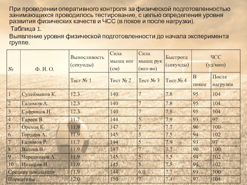 К работе были привлечены спортсмены 7-10 лет, занимающиеся в футбольной секции первый год. В эксперименте участвовало 10 человек.