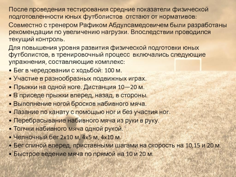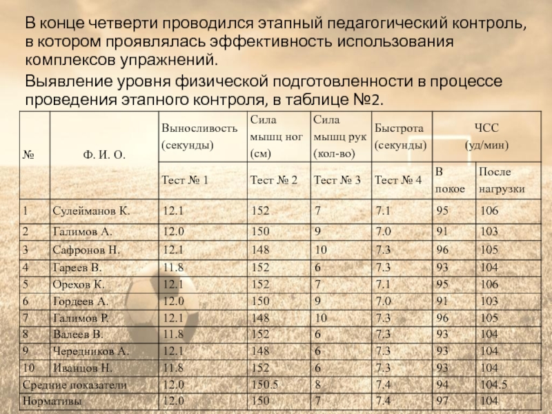 После проведения тестирования средние показатели физической подготовленности юных футболистов