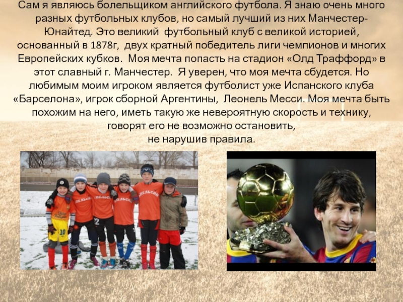 великий футбольный клуб с великой историей, основанный в 1878г, двух кратный победитель лиги чемпионов и многих Европейских кубков. Моя мечта попасть на стадион «Олд Траффорд» в этот славный г. Манчестер. Я уверен, что моя мечта сбудется. Но любимым моим игроком является футболист уже Испанского клуба «Барселона», игрок сборной Аргентины, Леонель Месси. Моя мечта быть похожим на него, иметь такую же невероятную скорость и технику, говорят его не возможно остановить,