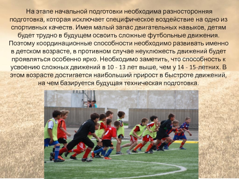 двигательных навыков, детям будет трудно в будущем освоить сложные футбольные движения. Поэтому координационные способности необходимо развивать именно в детском возрасте, в противном случае неуклюжесть движений будет проявляться особенно ярко. Необходимо заметить, что способность к усвоению сложных движений в 10 - 13 лет выше, чем у 14 - 15-летних. В этом возрасте достигается наибольший прирост в быстроте движений, на чем базируется будущая техническая подготовка.