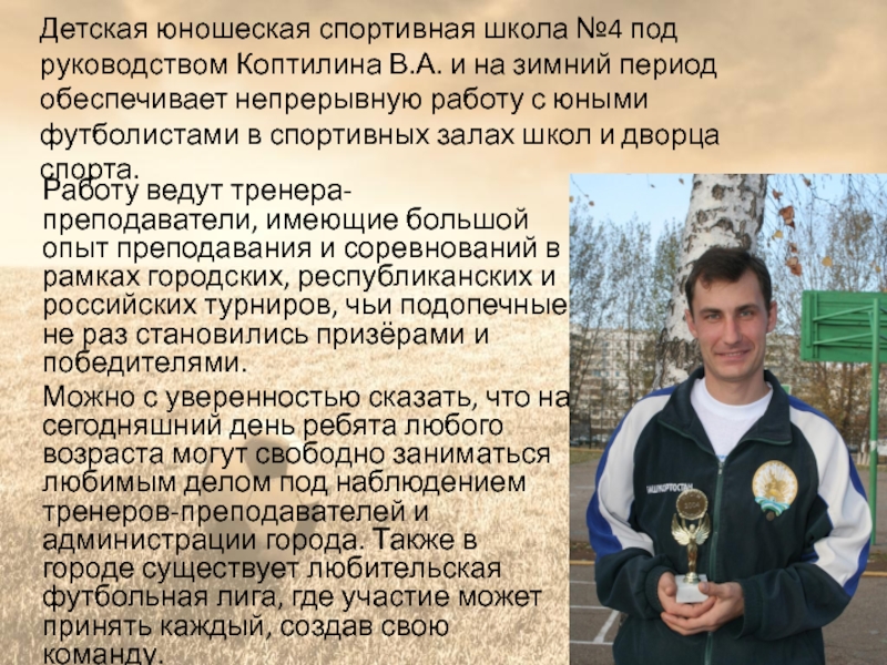 Слайд 7Детская юношеская спортивная школа №4 под руководством Коптилина В.А. и