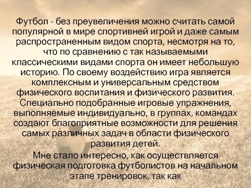 Из разнообразных средств физического воспитания особое внимание уделяется такой спортивной игре, как футбол. Я очень люблю футбол, которым занимаюсь с 5 лет