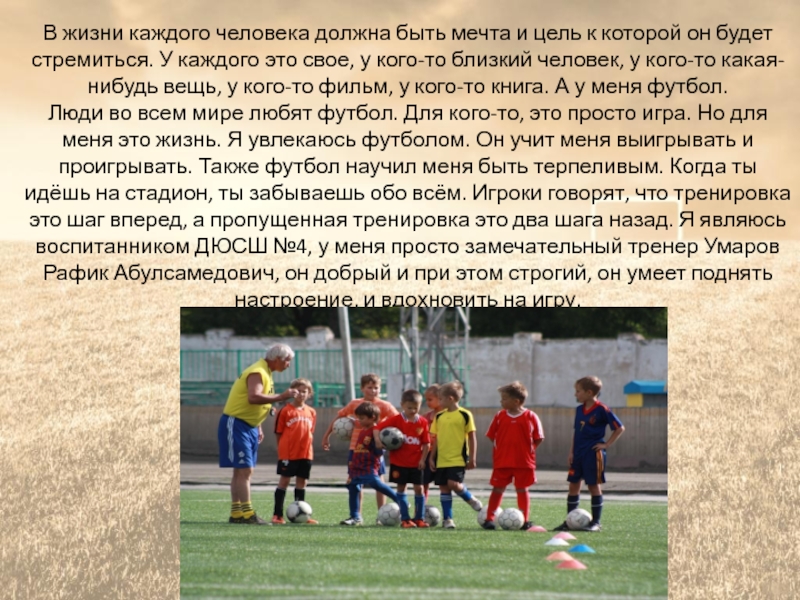 Люди во всем мире любят футбол. Для кого-то, это просто игра. Но для меня это жизнь. Я увлекаюсь футболом. Он учит меня выигрывать и проигрывать. Также футбол научил меня быть терпеливым. Когда ты идёшь на стадион, ты забываешь обо всём. Игроки говорят, что тренировка это шаг вперед, а пропущенная тренировка это два шага назад. Я являюсь воспитанником ДЮСШ №4, у меня просто замечательный тренер Умаров Рафик Абулсамедович, он добрый и при этом строгий, он умеет поднять настроение, и вдохновить на игру.