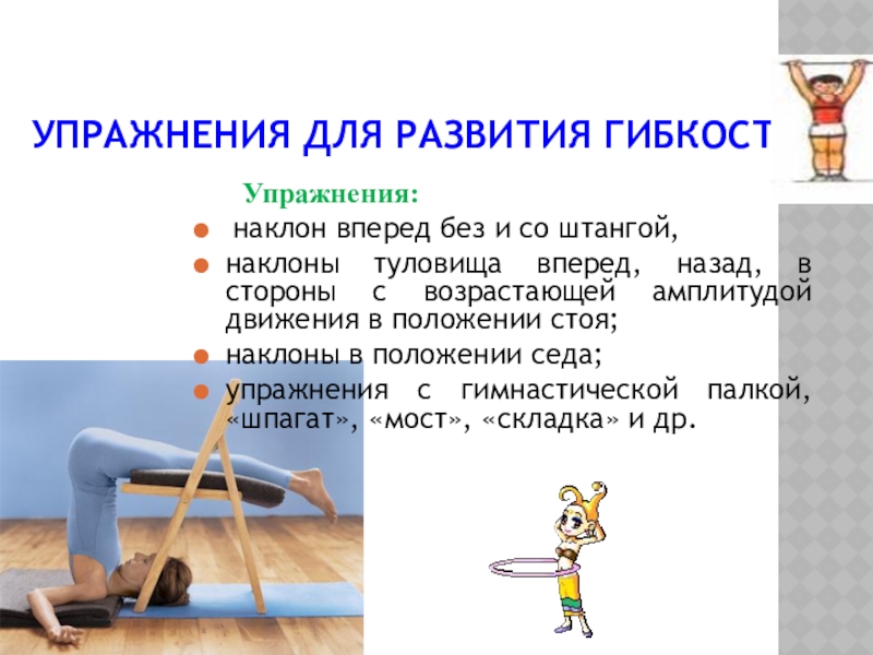 упражнения с гимнастической палкой, «шпагат», «мост», «складка» и др.