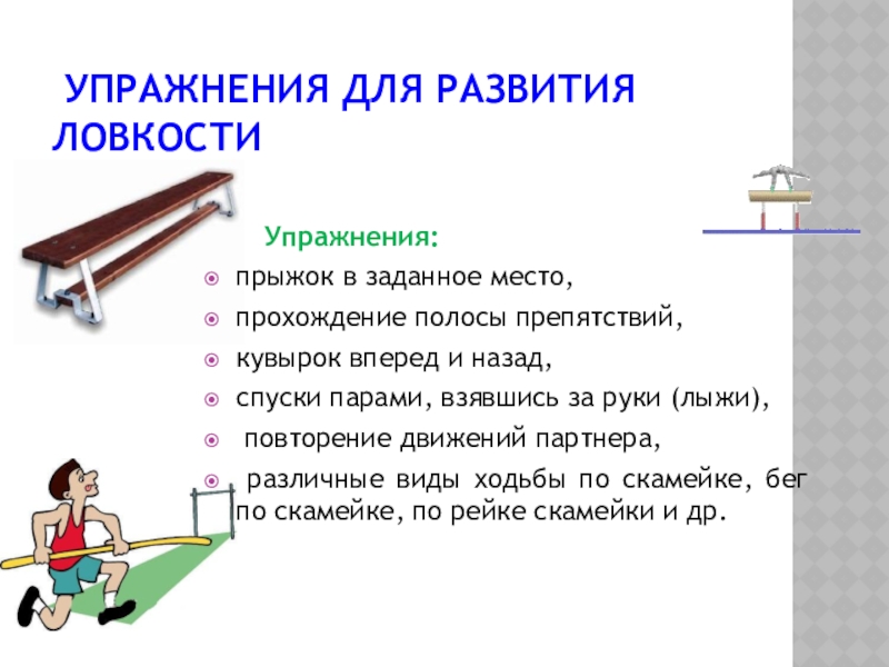 различные виды ходьбы по скамейке, бег по скамейке, по рейке скамейки и др.