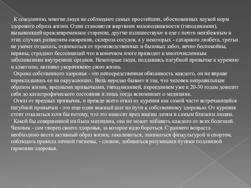 Охрана собственного здоровья - это непосредственная обязанность каждого, он не вправе перекладывать ее на окружающих. Ведь нередко бывает и так, что человек неправильным образом жизни, вредными привычками, гиподинамией, перееданием уже к 20-30 годам доводит себя до катастрофического состояния и лишь тогда вспоминает о медицине.