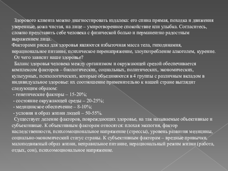 Баланс здоровья человека между организмом и окружающей средой обеспечивается комплексом факторов – биологических, социальных, политических, экономических, культурных, психологических, которые объединяются в 4 группы с различным вкладом в индивидуальное здоровье: их соотношение применительно к нашей стране выглядит следующим образом: