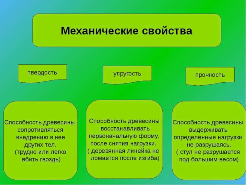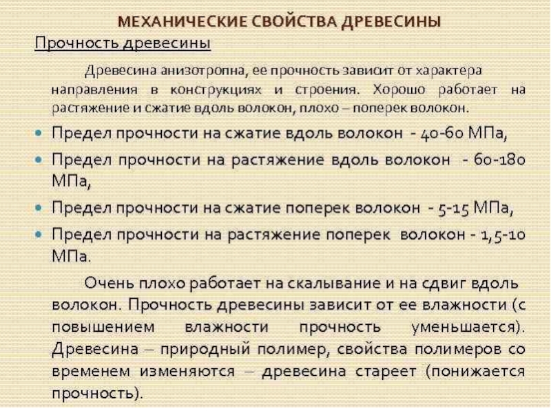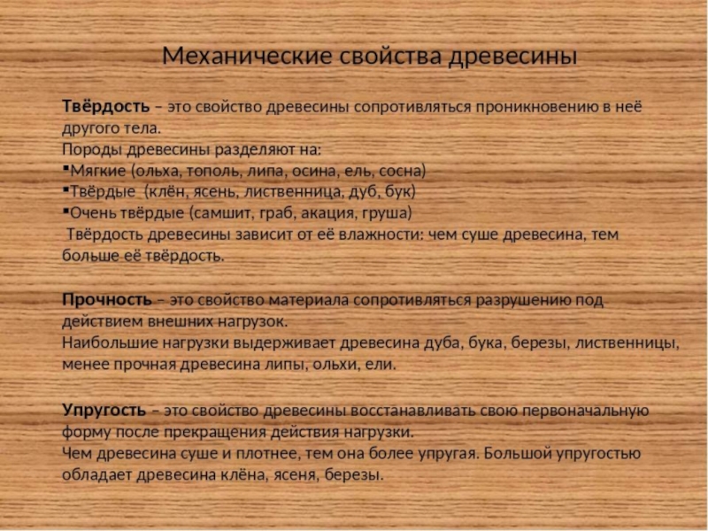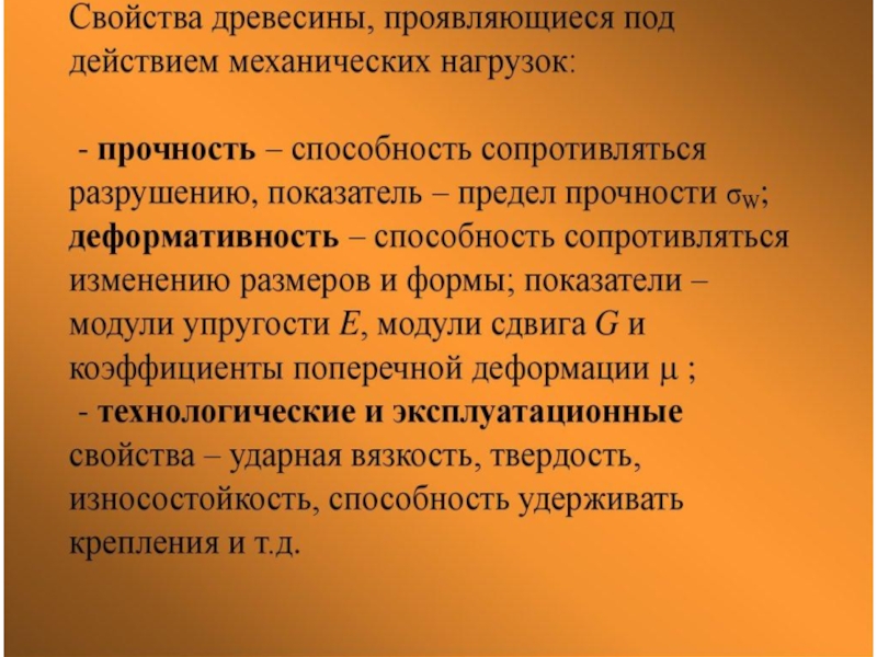 рассматривает действующие на древесину механические напряжения и вызываемые ими деформации,