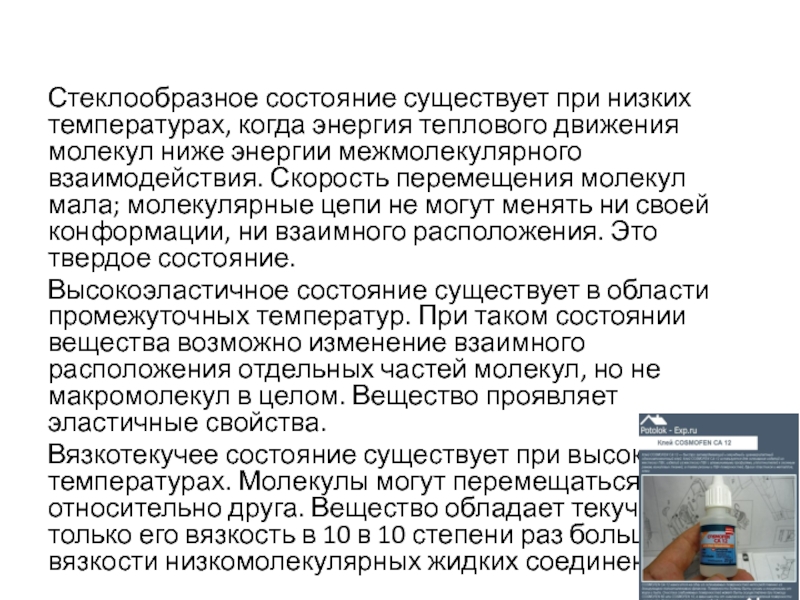 Вязкотекучее состояние существует при высоких температурах. Молекулы могут перемещаться друг относительно друга. Вещество обладает текучестью, только его вязкость в 10 в 10 степени раз больше вязкости низкомолекулярных жидких соединений.