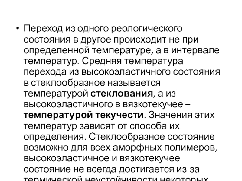 высокоэластичного состояния в стеклообразное называется температурой стеклования, а из высокоэластичного в вязкотекучее – температурой текучести. Значения этих температур зависят от способа их определения. Стеклообразное состояние возможно для всех аморфных полимеров, высокоэластичное и вязкотекучее состояние не всегда достигается из-за термической неустойчивости некоторых полимеров.