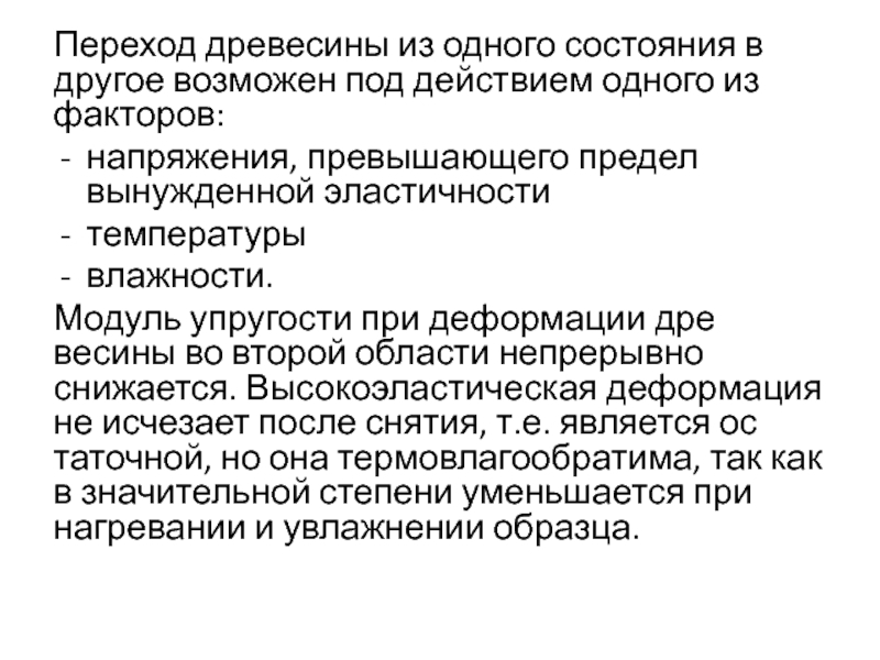 упругости при деформации древесины во второй области непрерывно снижается. Высокоэластическая деформация не исчезает после снятия, т.е. является остаточной, но она термовлагообратима, так как в значительной степени уменьшается при нагревании и увлажнении образца.
