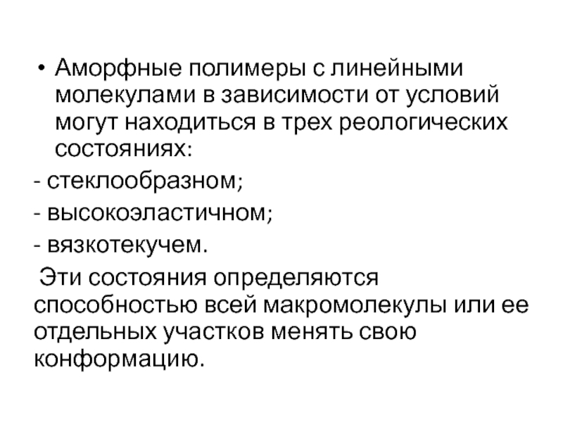 Слайд 53Аморфные полимеры с линейными молекулами в зависимости от условий могут