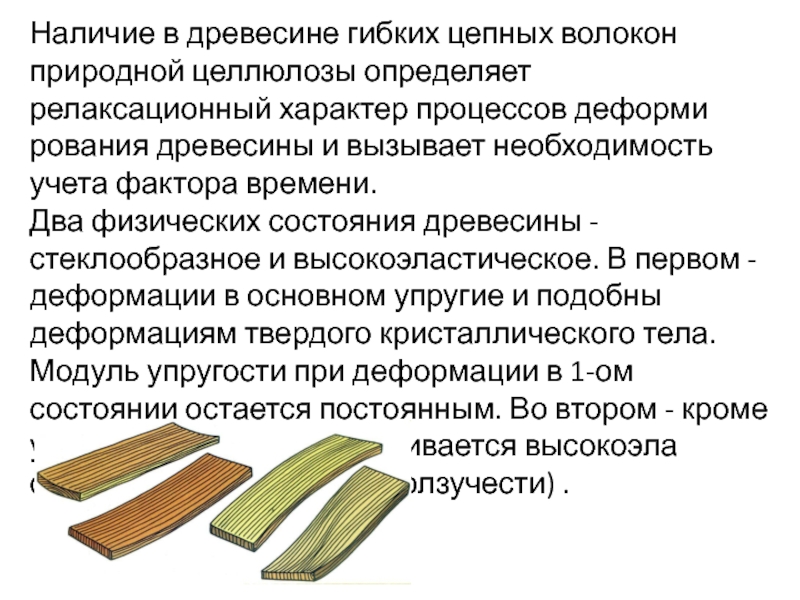 Слайд 64Наличие в древесине гибких цепных волокон природной целлюлозы определяет релаксационный