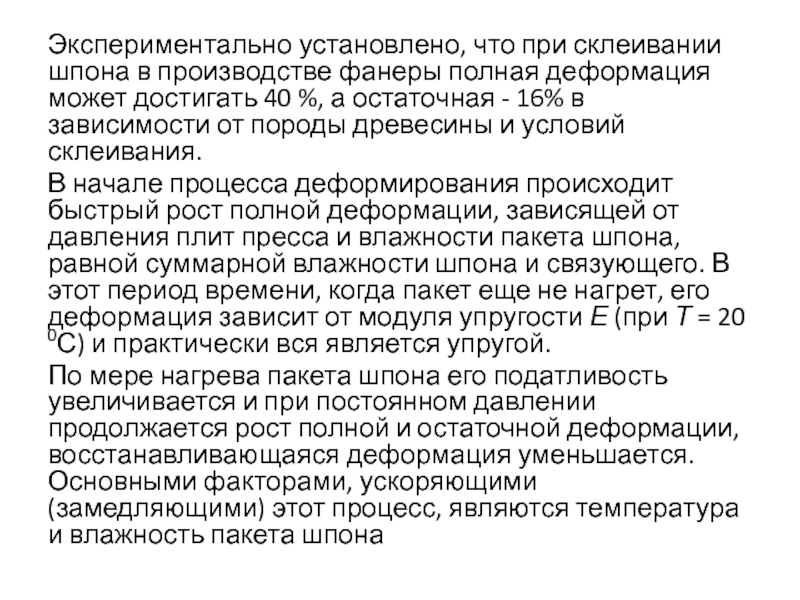 По мере нагрева пакета шпона его податливость увеличивается и при постоянном давлении продолжается рост полной и остаточной деформации, восстанавливающаяся деформация уменьшается. Основными факторами, ускоряющими (замедляющими) этот процесс, являются температура и влажность пакета шпона