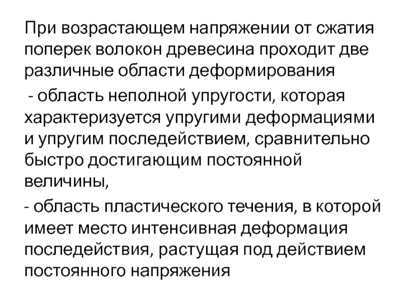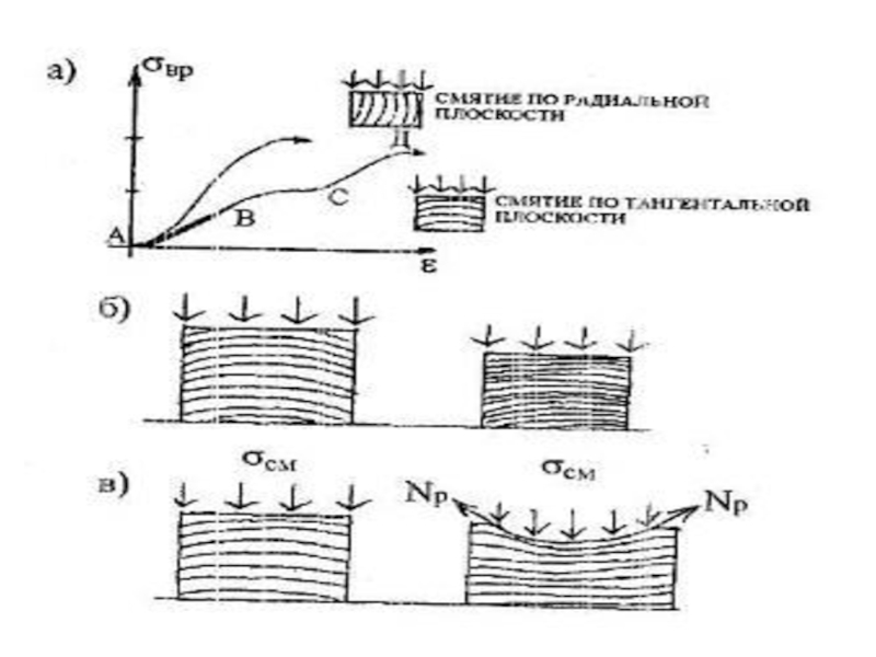 Слайд 61При возрастающем напряжении от сжатия поперек волокон древесина проходит две