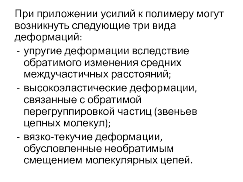 Слайд 60При приложении усилий к полимеру могут возникнуть следующие три вида