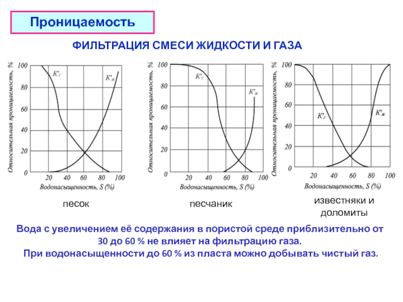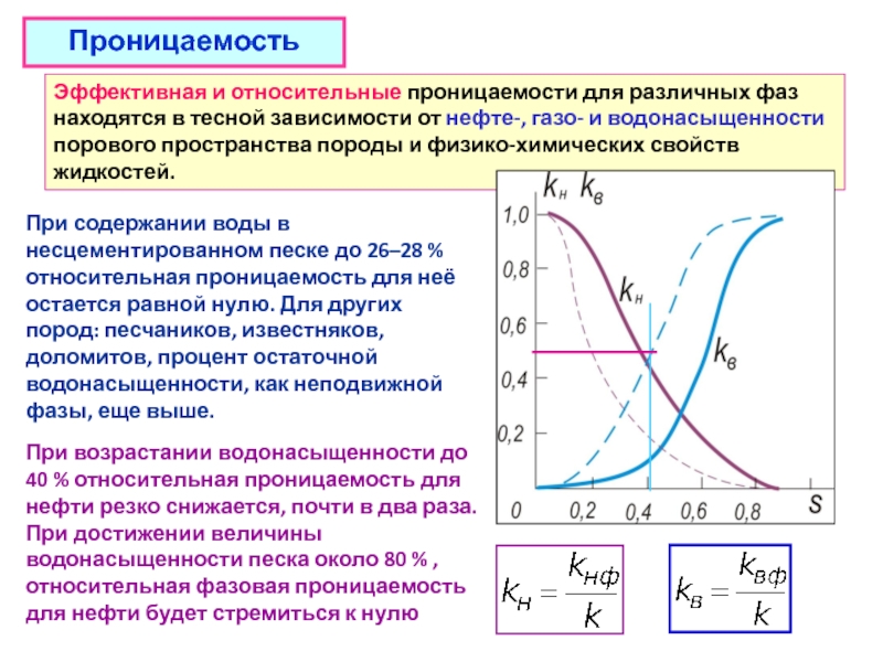 При содержании воды в несцементированном песке до 26–28 % относительная проницаемость для неё остается равной нулю. Для других пород: песчаников, известняков, доломитов, процент остаточной водонасыщенности, как неподвижной фазы, еще выше.