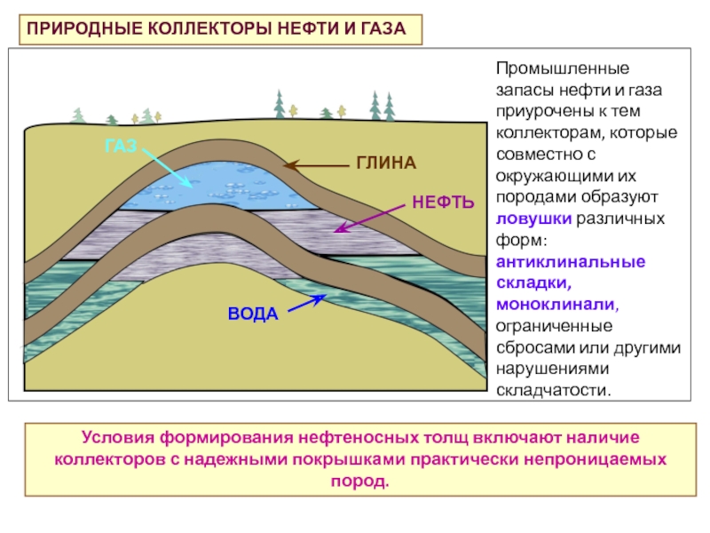 Условия формирования нефтеносных толщ включают наличие коллекторов с надежными покрышками практически непроницаемых пород.