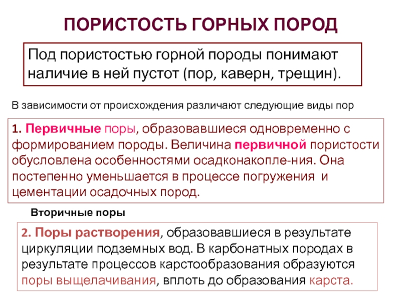 1. Первичные поры, образовавшиеся одновременно с формированием породы. Величина первичной пористости обусловлена особенностями осадконакопле-ния. Она постепенно уменьшается в процессе погружения и цементации осадочных пород.