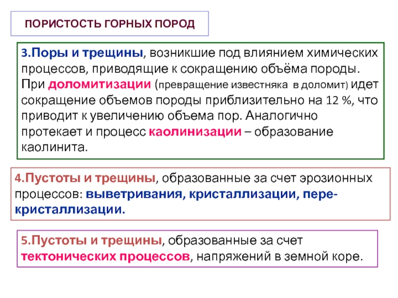 4.Пустоты и трещины, образованные за счет эрозионных процессов: выветривания, кристаллизации, пере-кристаллизации.