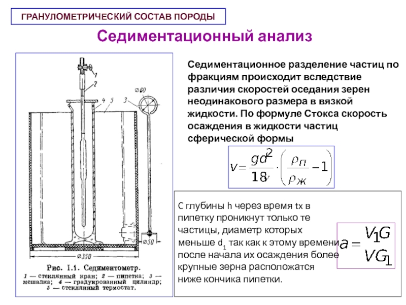 C глубины h через время tx в пипетку проникнут только те частицы, диаметр которых меньше d1 так как к этому времени после начала их осаждения более крупные зерна расположатся ниже кончика пипетки.
