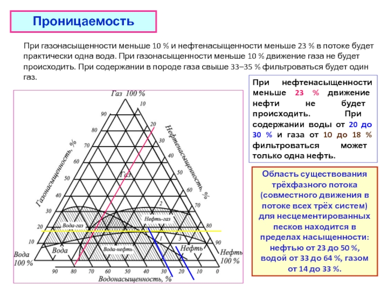 При нефтенасыщенности меньше 23 % движение нефти не будет происходить. При содержании воды от 20 до 30 % и газа от 10 до 18 % фильтроваться может только одна нефть.