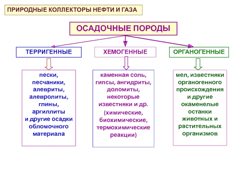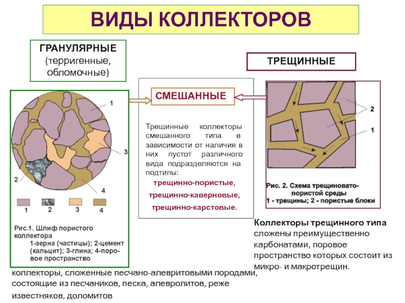 коллекторы, сложенные песчано-алевритовыми породами, состоящие из песчаников, песка, алевролитов, реже известняков, доломитов