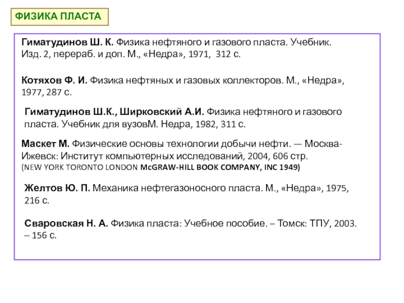 Гиматудинов Ш.К., Ширковский А.И. Физика нефтяного и газового пласта. Учебник для вузовМ. Недра, 1982, 311 с.