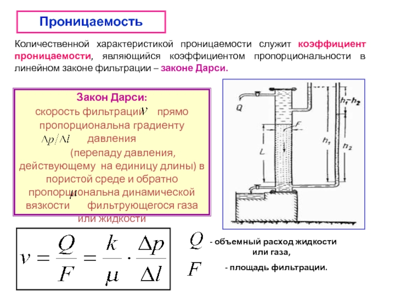 За единицу проницаемости в 1 м2 принимается проницаемость такой пористой среды, при фильтрации через образец которой площадью 1 м2 , длиной 1 м и перепаде давления 1 Па расход жидкости вязкостью 1 Па·с составляет 1 м3 /с.