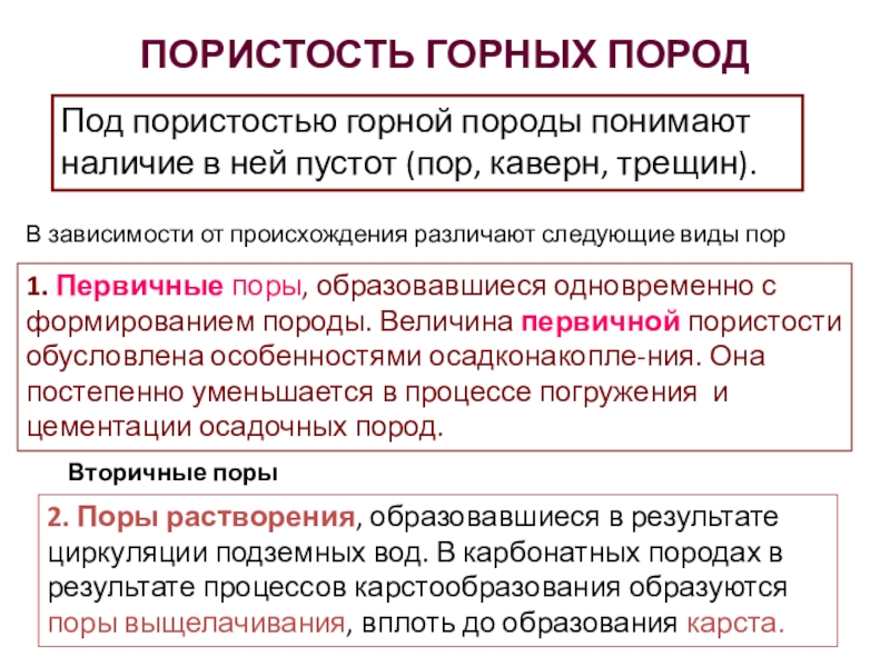 1. Первичные поры, образовавшиеся одновременно с формированием породы. Величина первичной пористости обусловлена особенностями осадконакопле-ния. Она постепенно уменьшается в процессе погружения и цементации осадочных пород.