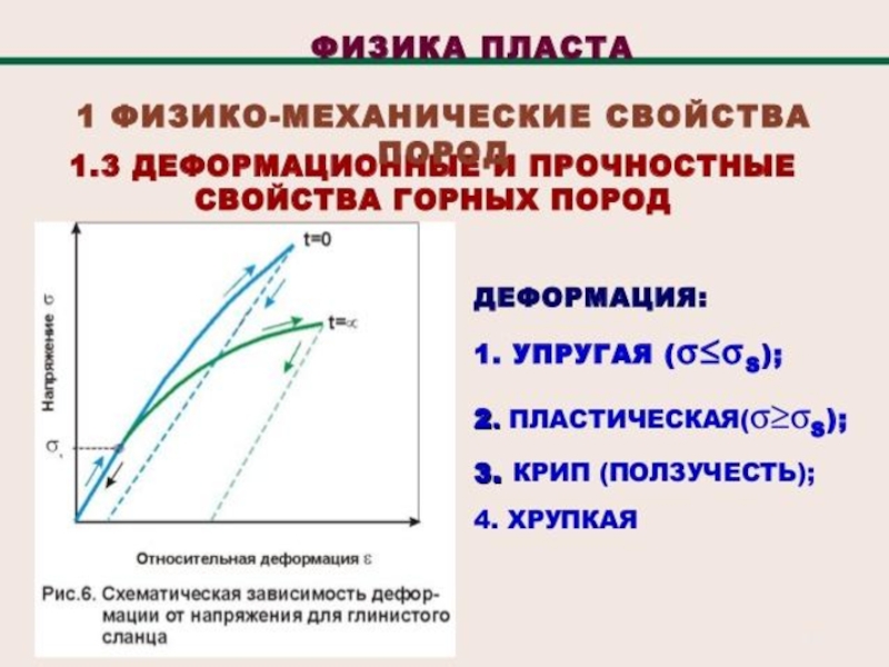 Упругость – свойство горных пород сопротивляться изменению их объёма и формы под действием приложенных сил. Абсолютно упругое тело восстанавливает первоначальную форму мгновенно после снятия напряжения. Если тело не восстанавливает первоначальную форму или восстанавливает её в течение длительного времени, то оно называется пластичным.