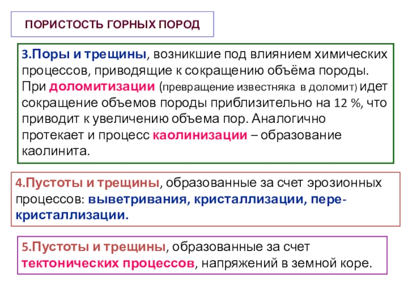 4.Пустоты и трещины, образованные за счет эрозионных процессов: выветривания, кристаллизации, пере-кристаллизации.