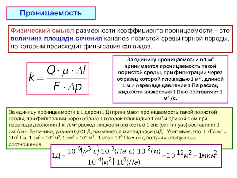 За единицу проницаемости в 1 м2 принимается проницаемость такой пористой среды, при фильтрации через образец которой площадью 1 м2 , длиной 1 м и перепаде давления 1 Па расход жидкости вязкостью 1 Па·с составляет 1 м3 /с.