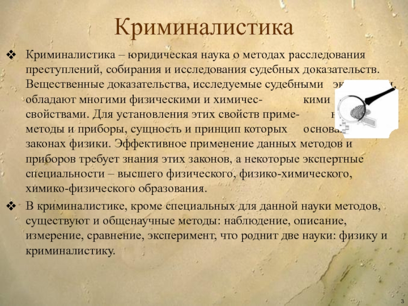В криминалистике, кроме специальных для данной науки методов, существуют и общенаучные методы: наблюдение, описание, измерение, сравнение, эксперимент, что роднит две науки: физику и криминалистику.