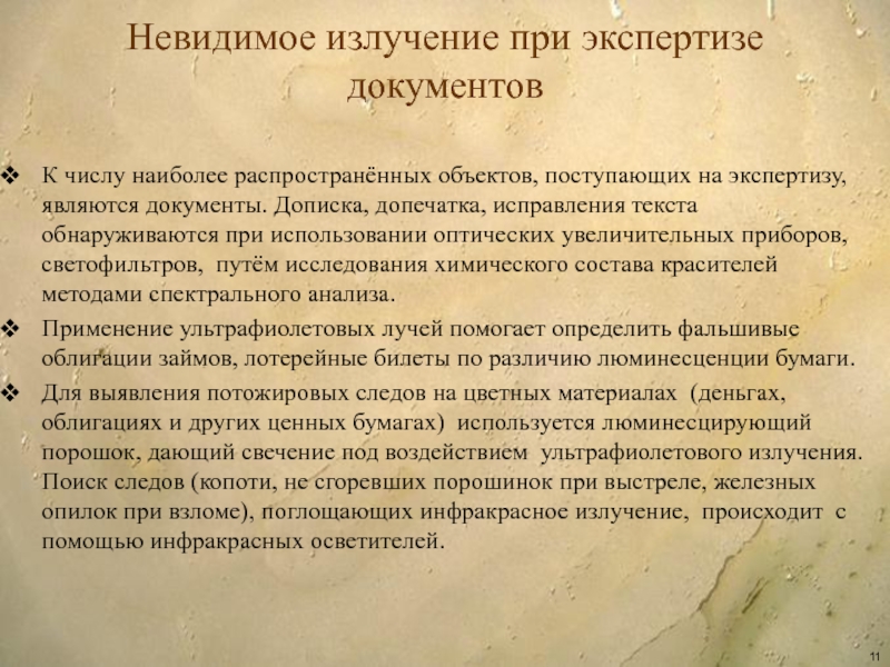 Слайд 11Невидимое излучение при экспертизе документов
