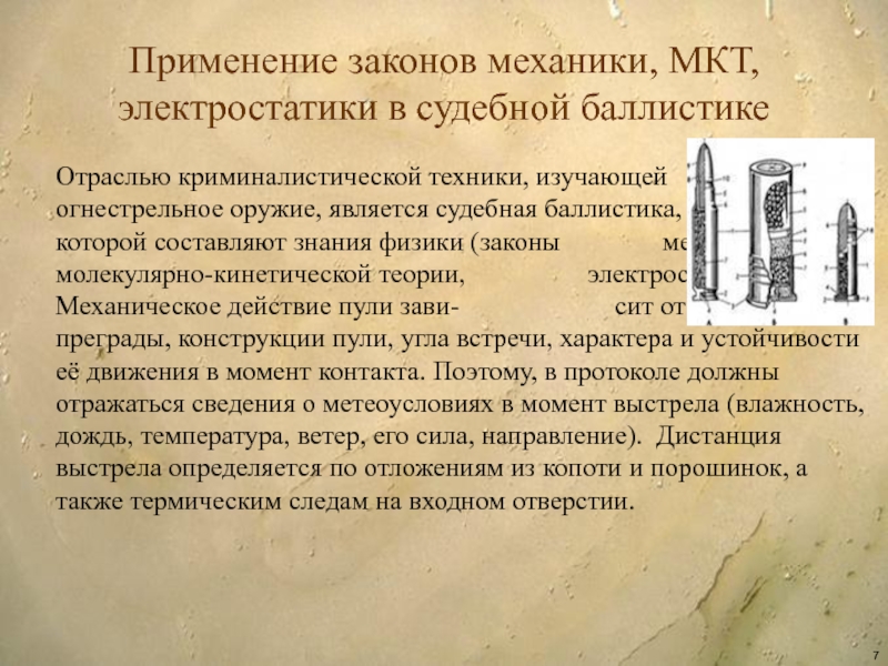 Слайд 7Применение законов механики, МКТ, электростатики в судебной баллистике