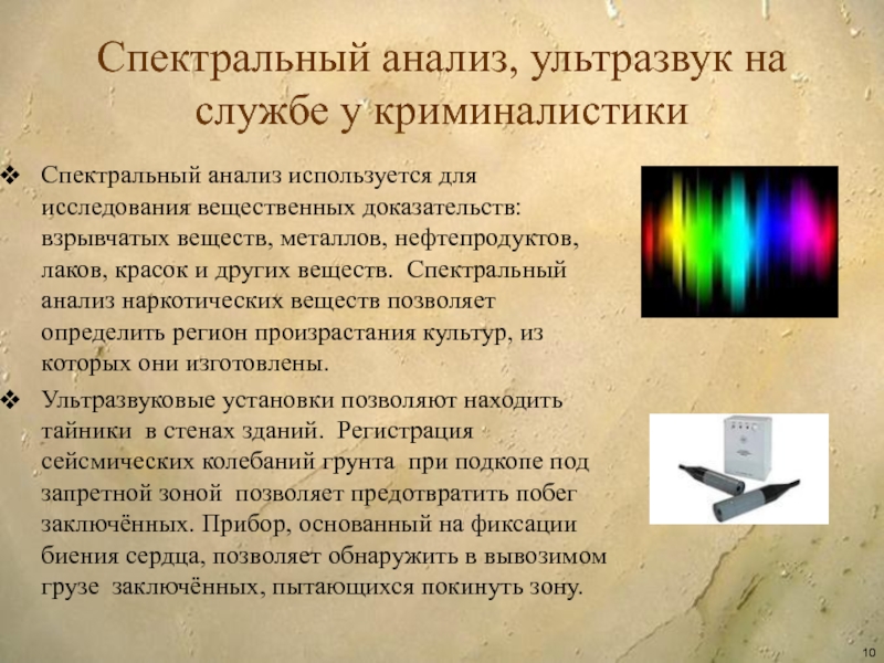 Слайд 10Спектральный анализ, ультразвук на службе у криминалистики