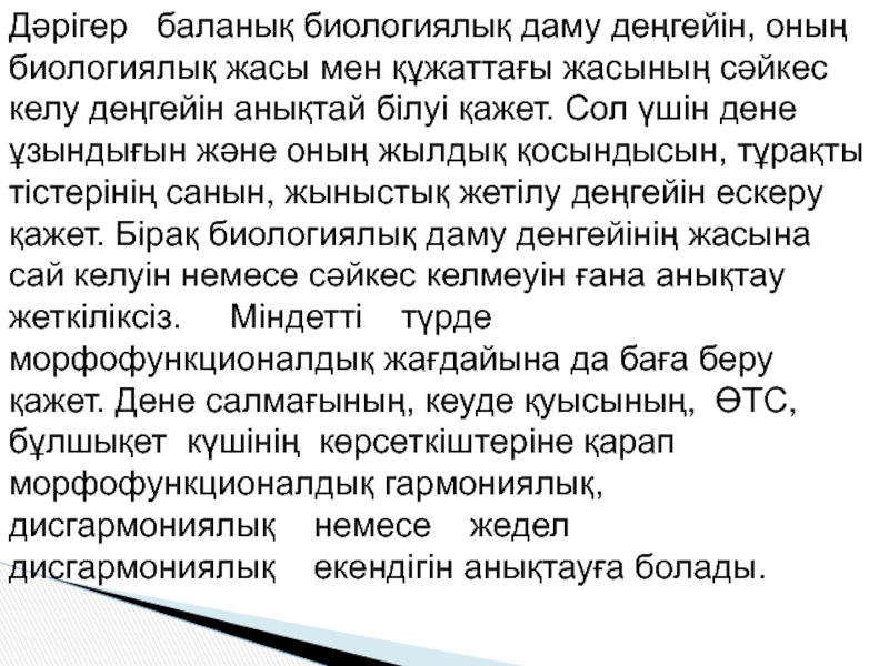 Слайд 8Дәрігер баланық биологиялық даму деңгейін, оның биологиялық жасы мен